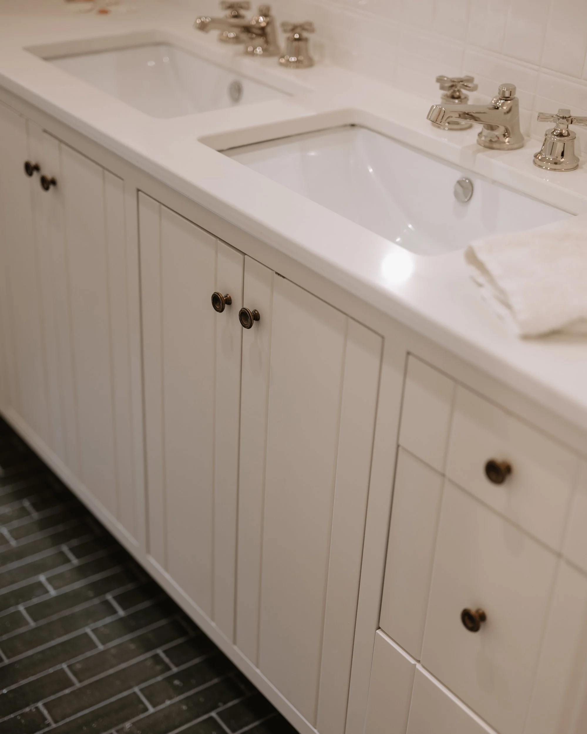 A traditional house in a secluded pocket, with views out into the treetops meets an art collection (mostly contemporary) and a mix of furniture and decorative pieces—some inherited, some collected, all with attachments. A soft, creamy off-white bathes the main level from floor to ceiling, unifying previous interventions, and creating an airy gallery-like setting for the aforementioned collections without feeling stark. Limestone counters and backsplash extend the soft, light coloration and lend depth and texture to the kitchen while echoing the patination of the mixed nickels, brasses, and bronzes introduced throughout the house. With a curatorial eye, plumbing fixtures, lighting, hardware, millwork and furnishings reinterpret and emphasize both the traditional and the more sculptural, contemporary aspects of the art collection. Contrast, sparing use of color for emphasis, and texture characterize most of the family-friendly spaces while a daughter’s bedroom becomes a whimsical jewel where color, pattern, and playful shapes abound.